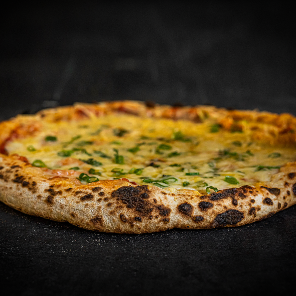 Salsa de tomates, mozzarella, provolone orgánico y verdeo.